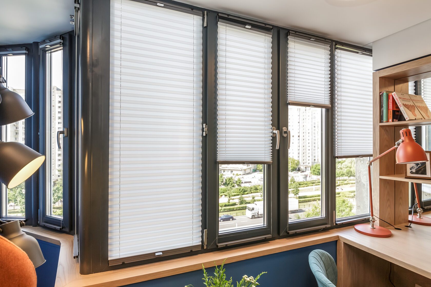 Шторы плиссе смотрятся аккуратно и не занимают много места, оставляя подоконник свободным, что делает их идеальным выбором для небольших помещений.